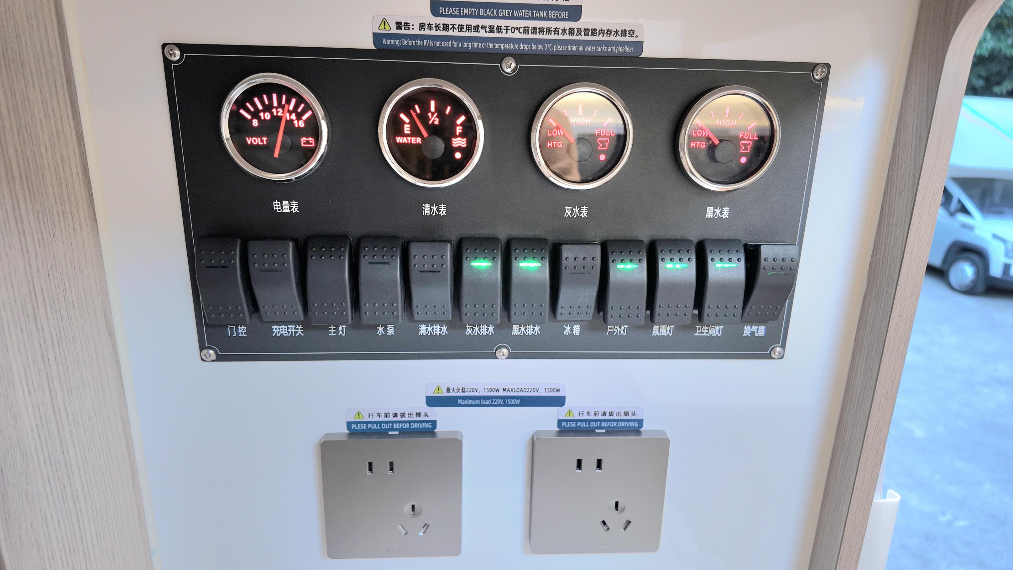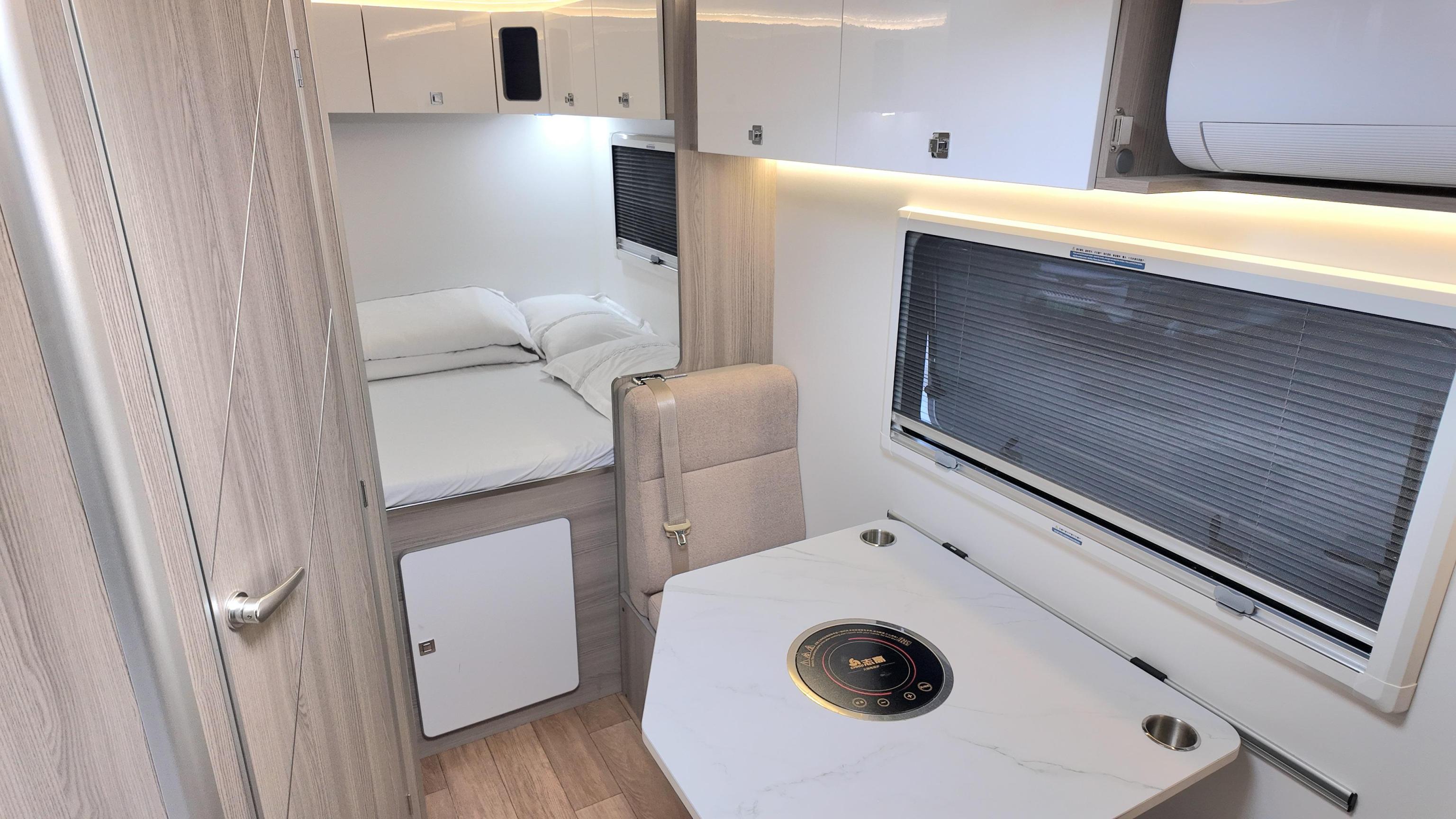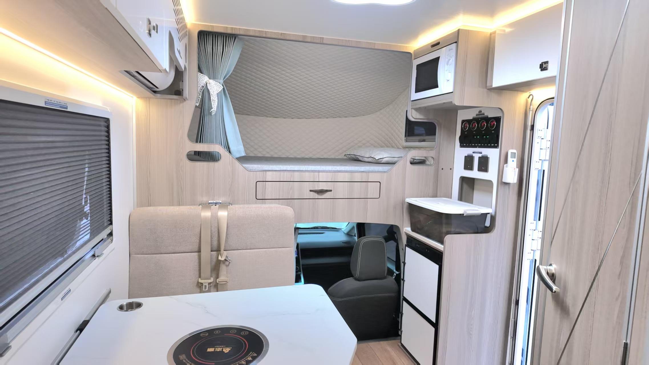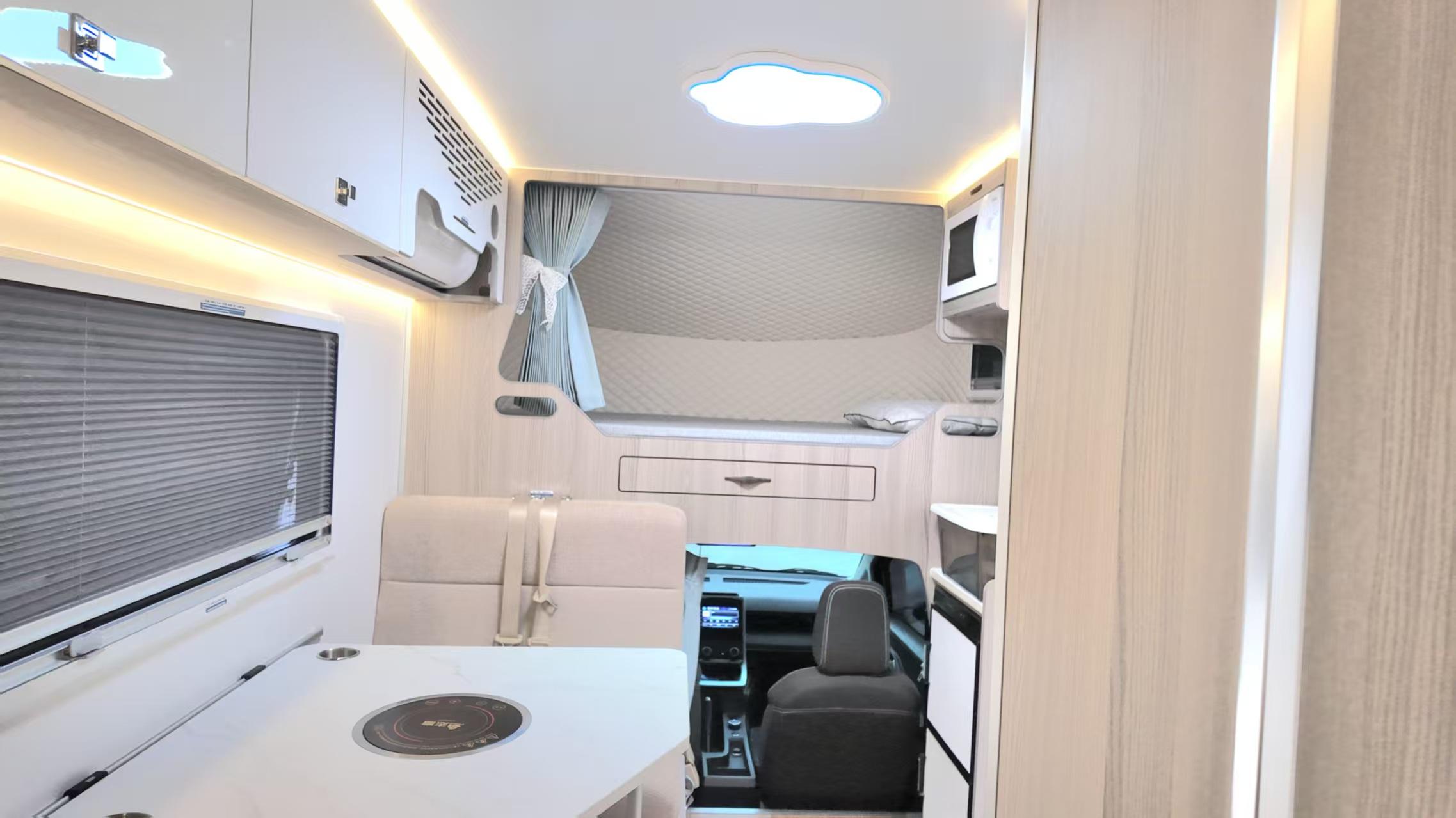 车辆配备车头LED灯,前后流媒体影像,电子助力方向盘,高清倒车影像,驾驶室环保织物座椅,TCL冷暖大一匹变频静音节能家用空调,70升房车专用冰箱,三人位对向卡座,配电磁炉多功能桌,格兰仕微波炉1140升超大行李舱,全车隐私玻璃、防蚊纱窗纱门、房车中门普通钥匙门锁、卫生间陶瓷一体马桶(专利电子粉碎式马桶,无需倾倒黑水箱,一键操作、方便洁净),灯光美妆镜、抽拉式淋浴花洒及洗脸盆、洗手间换气扇。清水300升,灰水80升、黑水箱100升,户外遮阳棚和LED露营氛围灯,冷热水户外花洒、电动上车踏步,配有户外餐厨操作托架及电磁炉,户外桌椅一套(一桌四椅)。