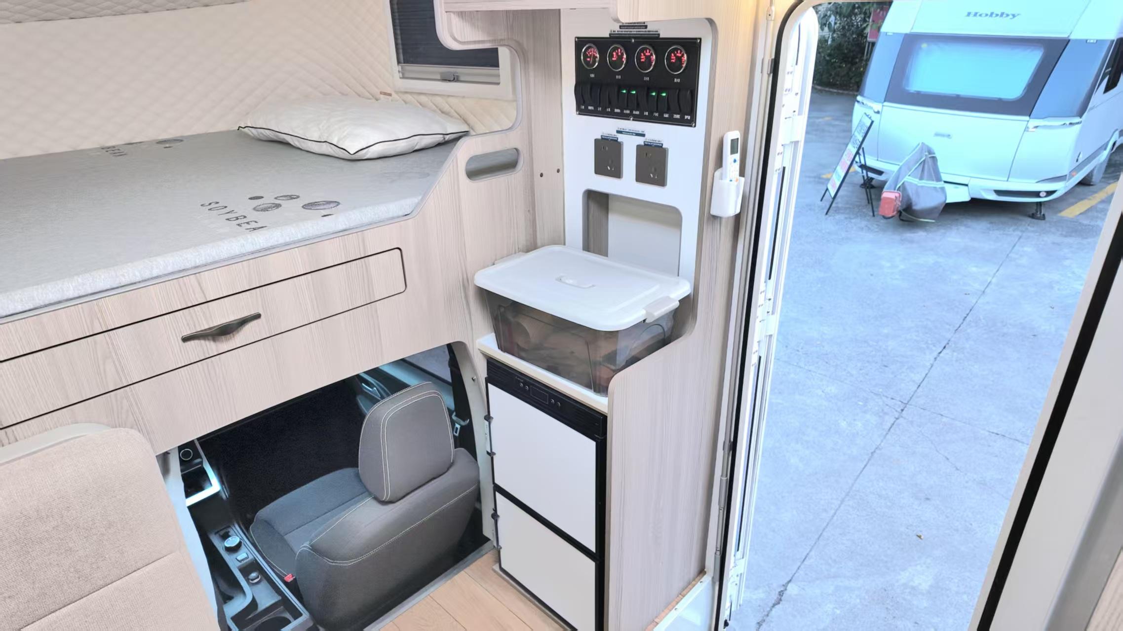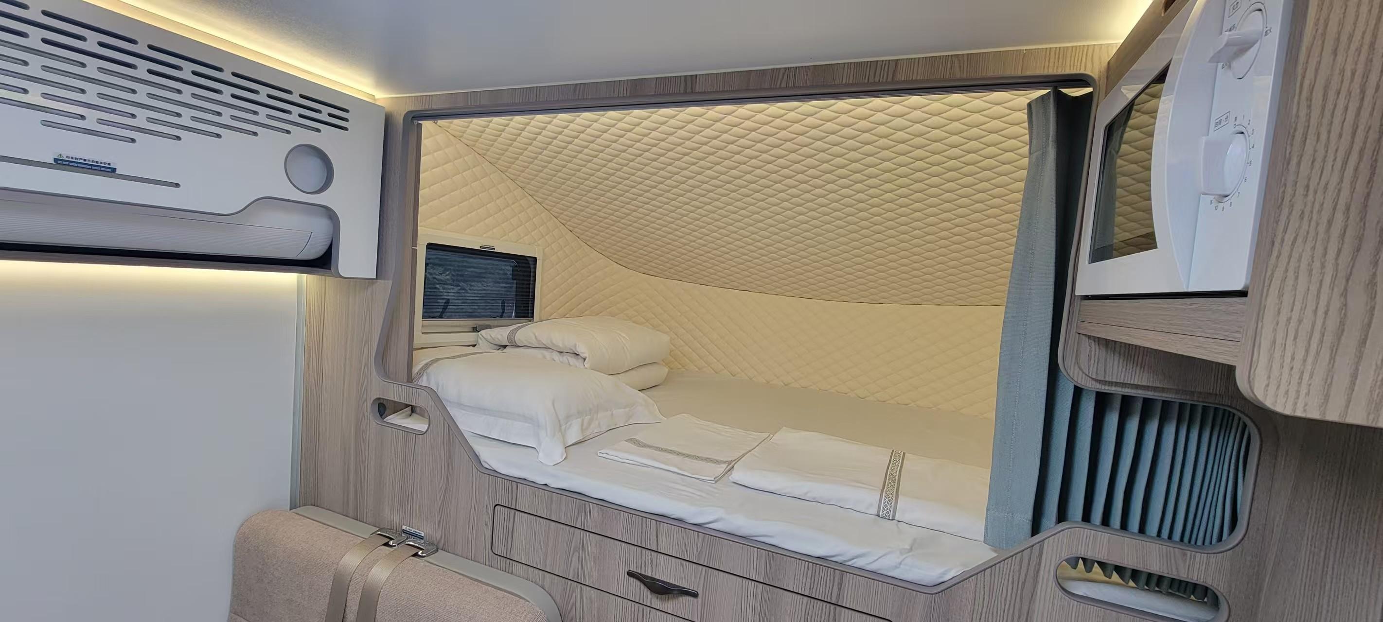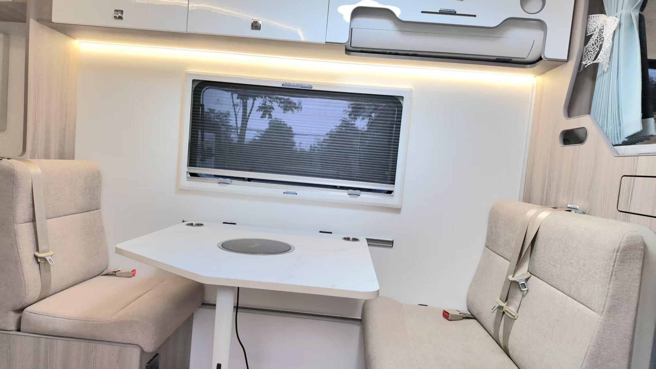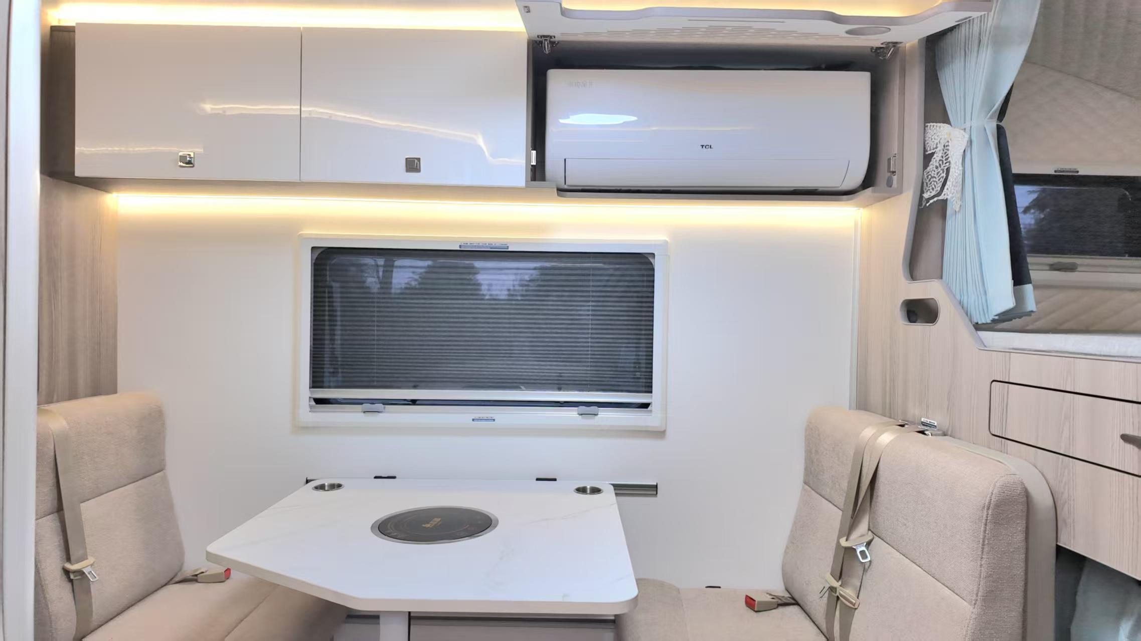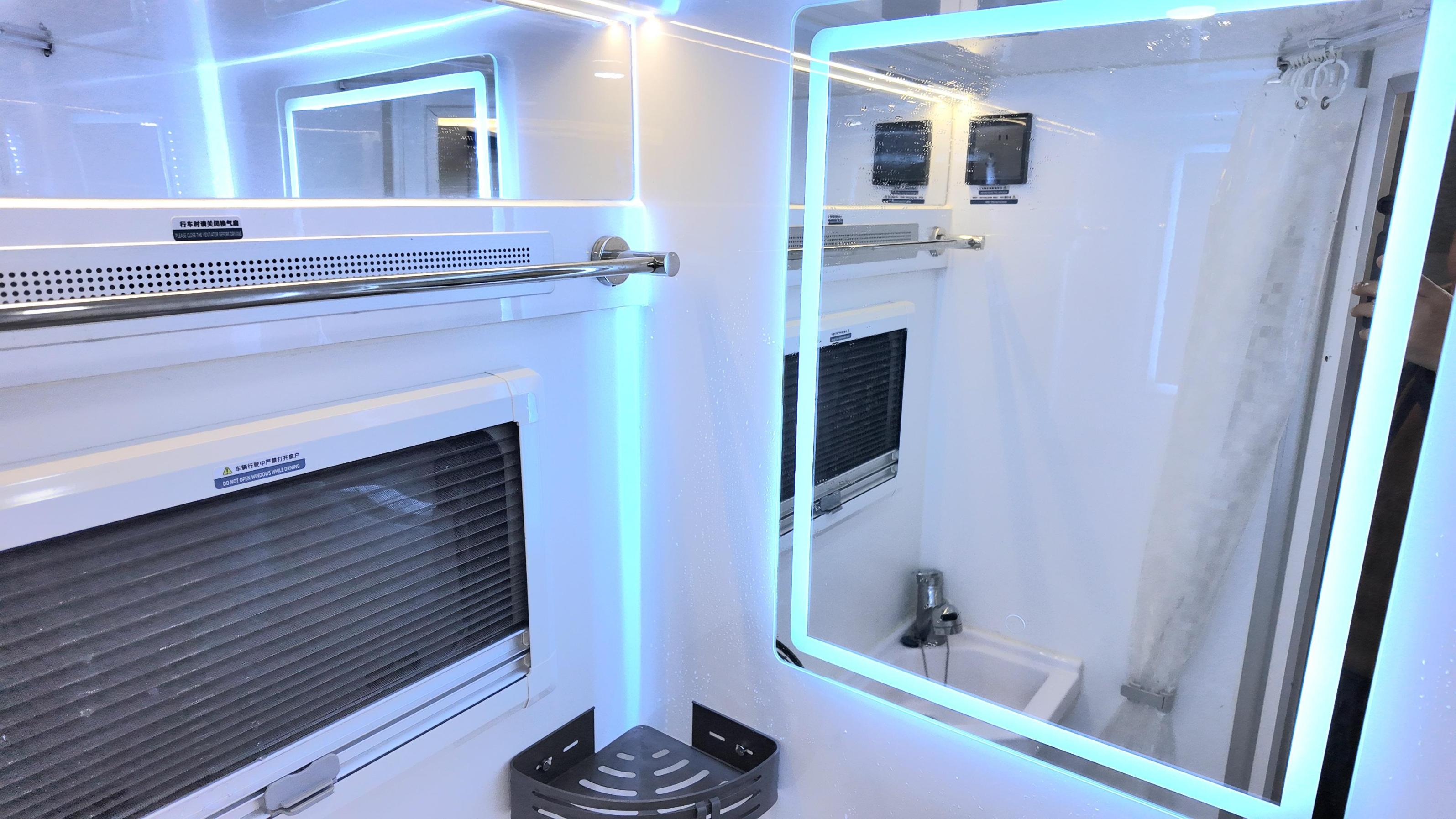 车辆配备车头LED灯,前后流媒体影像,电子助力方向盘,高清倒车影像,驾驶室环保织物座椅,TCL冷暖大一匹变频静音节能家用空调,70升房车专用冰箱,三人位对向卡座,配电磁炉多功能桌,格兰仕微波炉1140升超大行李舱,全车隐私玻璃、防蚊纱窗纱门、房车中门普通钥匙门锁、卫生间陶瓷一体马桶(专利电子粉碎式马桶,无需倾倒黑水箱,一键操作、方便洁净),灯光美妆镜、抽拉式淋浴花洒及洗脸盆、洗手间换气扇。清水300升,灰水80升、黑水箱100升,户外遮阳棚和LED露营氛围灯,冷热水户外花洒、电动上车踏步,配有户外餐厨操作托架及电磁炉,户外桌椅一套(一桌四椅)。