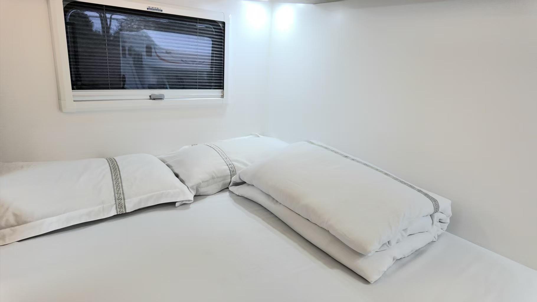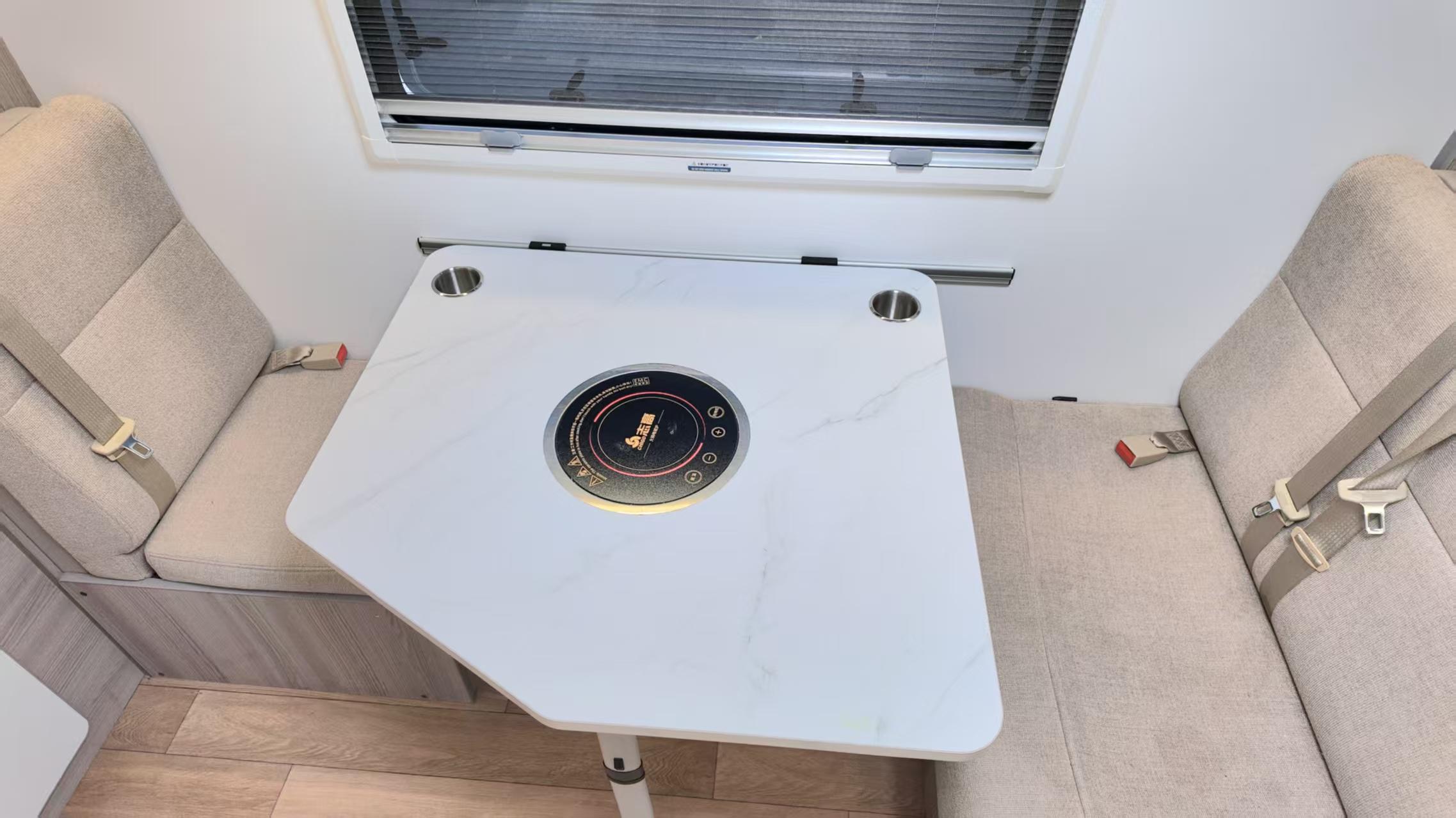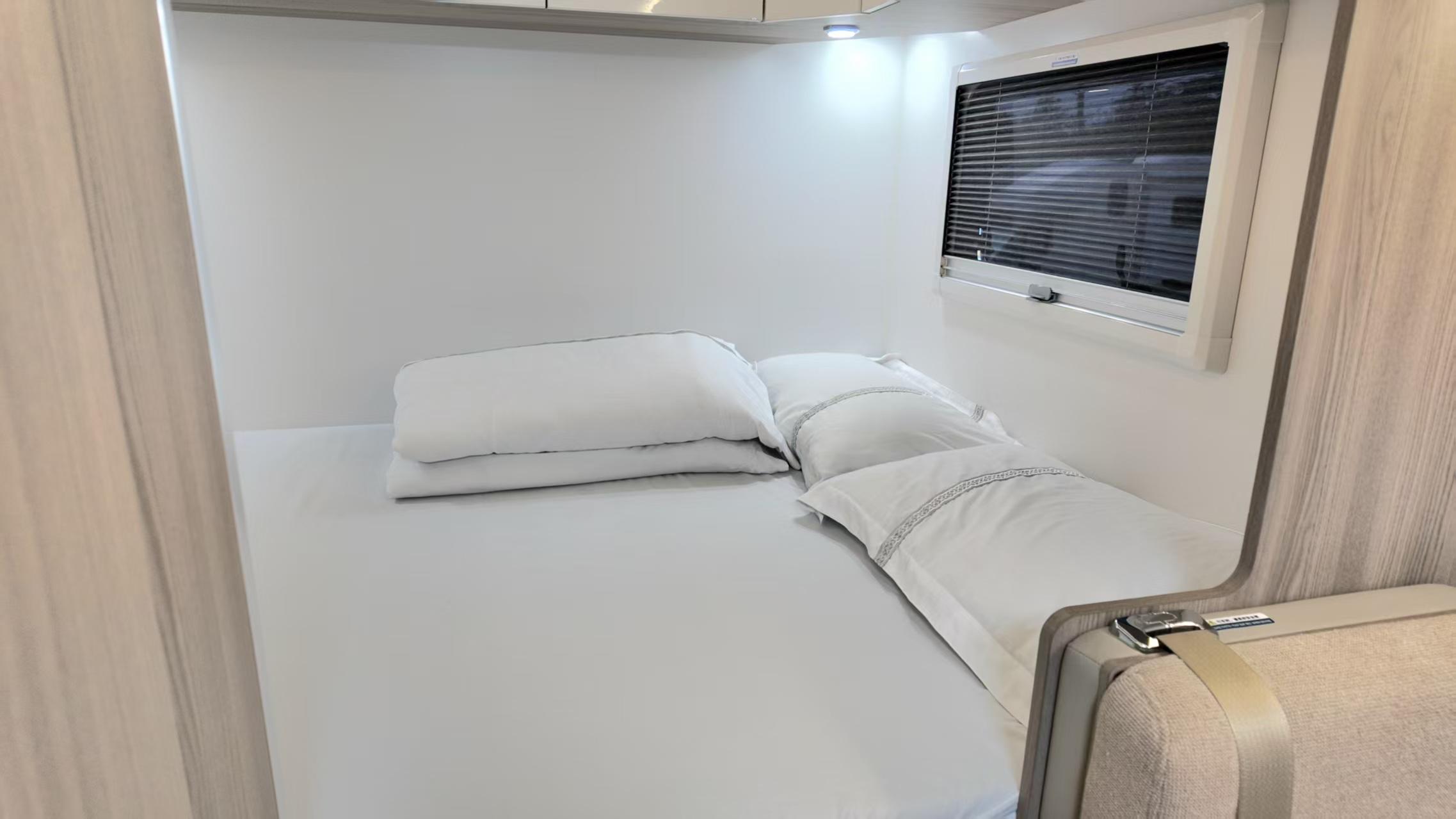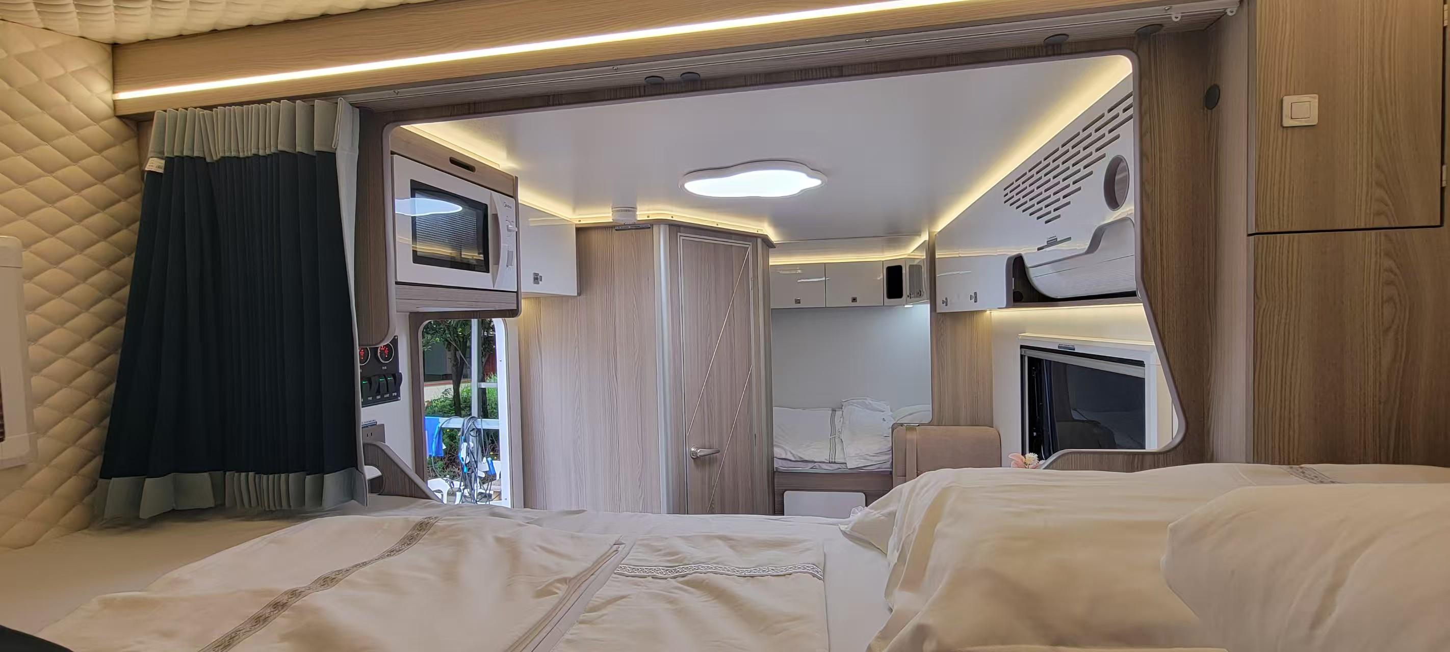 长5995 宽2126 高2875 荷载6人,为额头床+后侧横向1.45米大床车型,床位布局为2+1,配有两张固定床铺(1350×2010×1,1450×2010×1),一张临时床(为对向卡座与折叠桌拼床)。