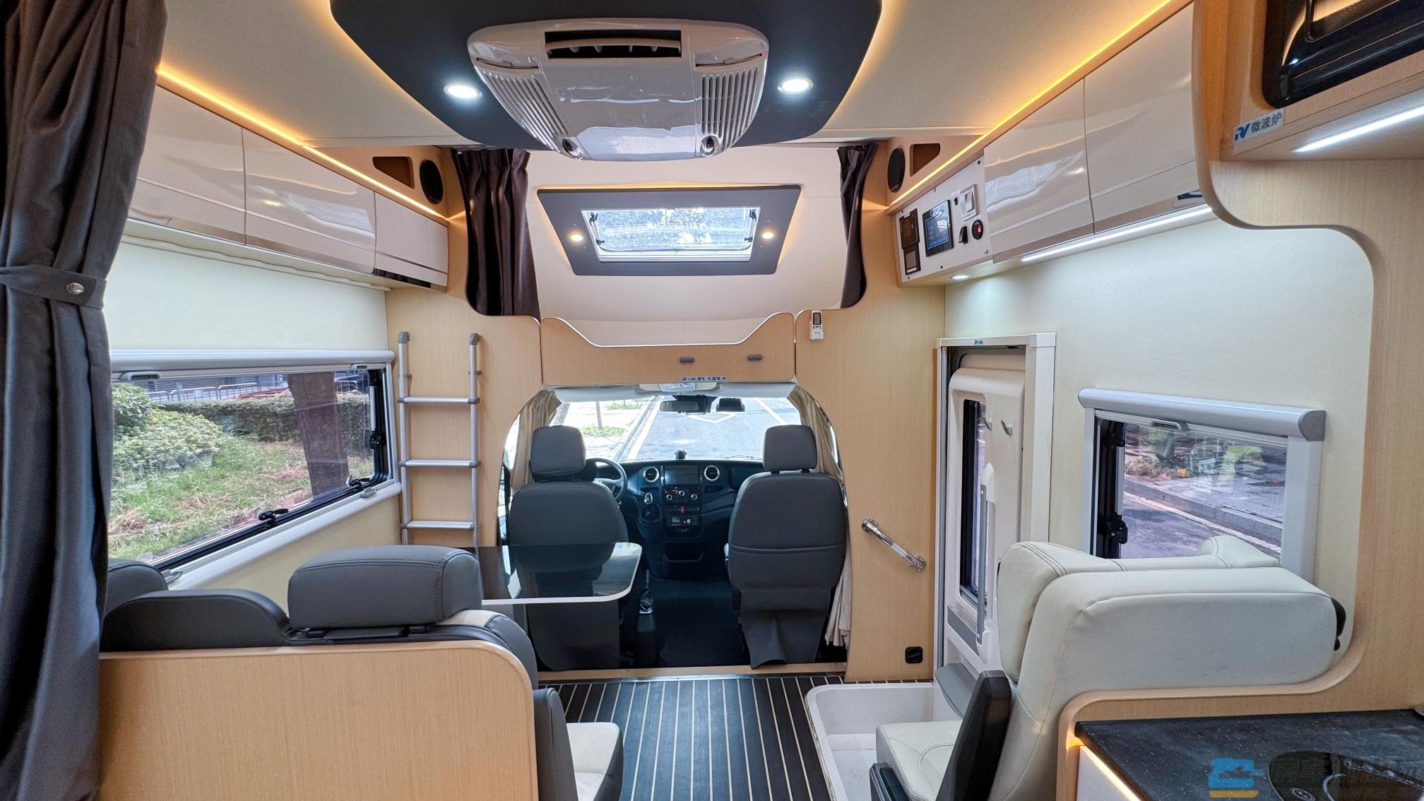 生活区:整车内部板材为仿实木地板革,车身外部采用带纱窗中控乘客门,扶手为带灯上下扶手电动伸缩式踏步乘客门,正副司机门上车踏步。乘客区及卫生间推窗均为中空亚克力外推窗,驾驶区上床铺两侧推拉窗,纵床外推窗,L 形卡座推拉窗,带外置置物板