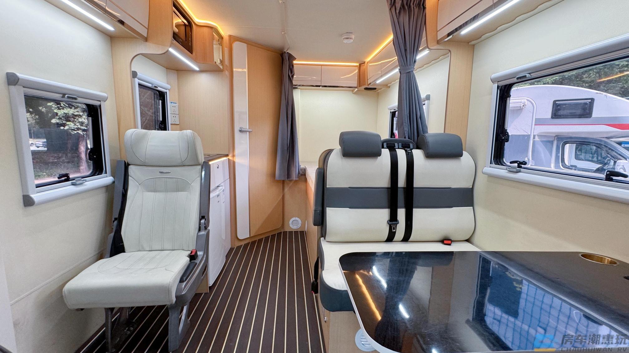生活区配备 L 型卡座(L 型卡座可变单人床),为布艺+皮革面料材质,以及升降式餐桌(气动升降+水平四向可调),车内后部纵置双人床,环形沙发左侧外推推拉窗处拉帘带布艺;前后床铺拉帘,驾驶室拉帘+环形卡座左侧外推窗处拉帘+后床铺 。