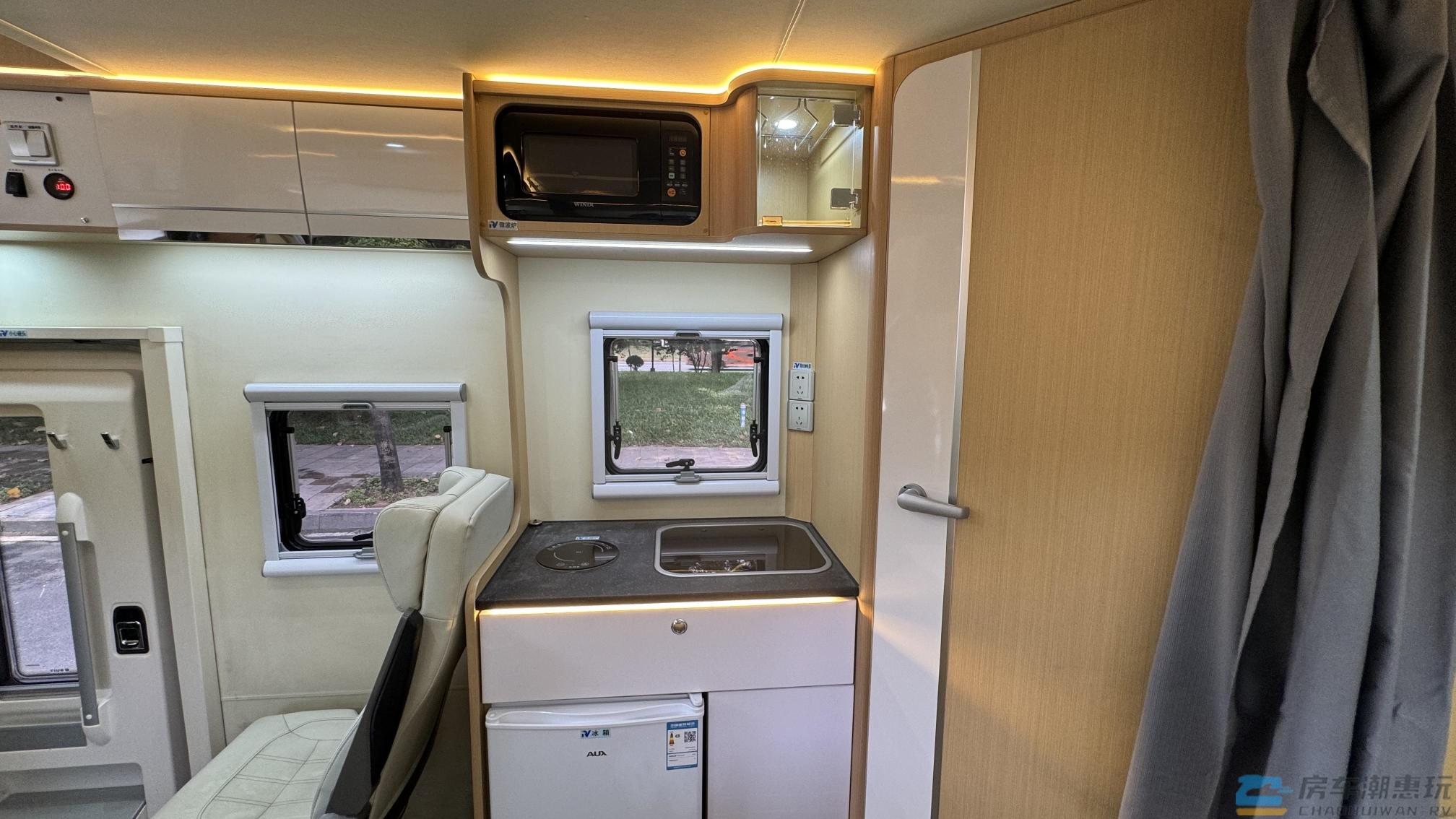 厨房:整体式厨房900w微波炉等一应俱全,12V房车专用 85L 冰箱,为健康的旅居生活竭尽所能