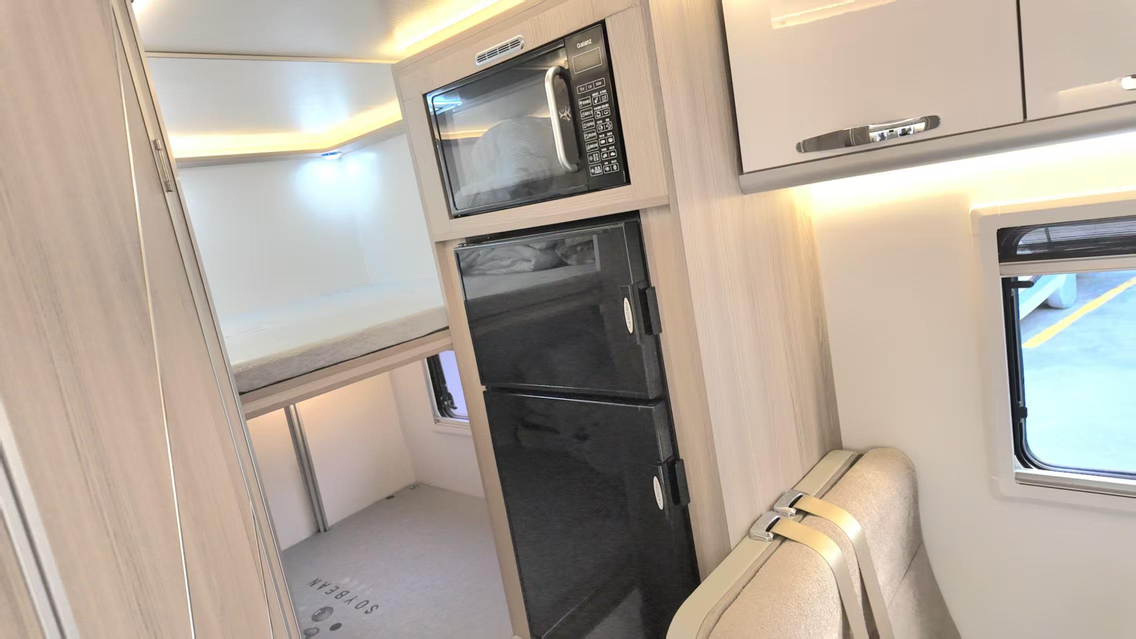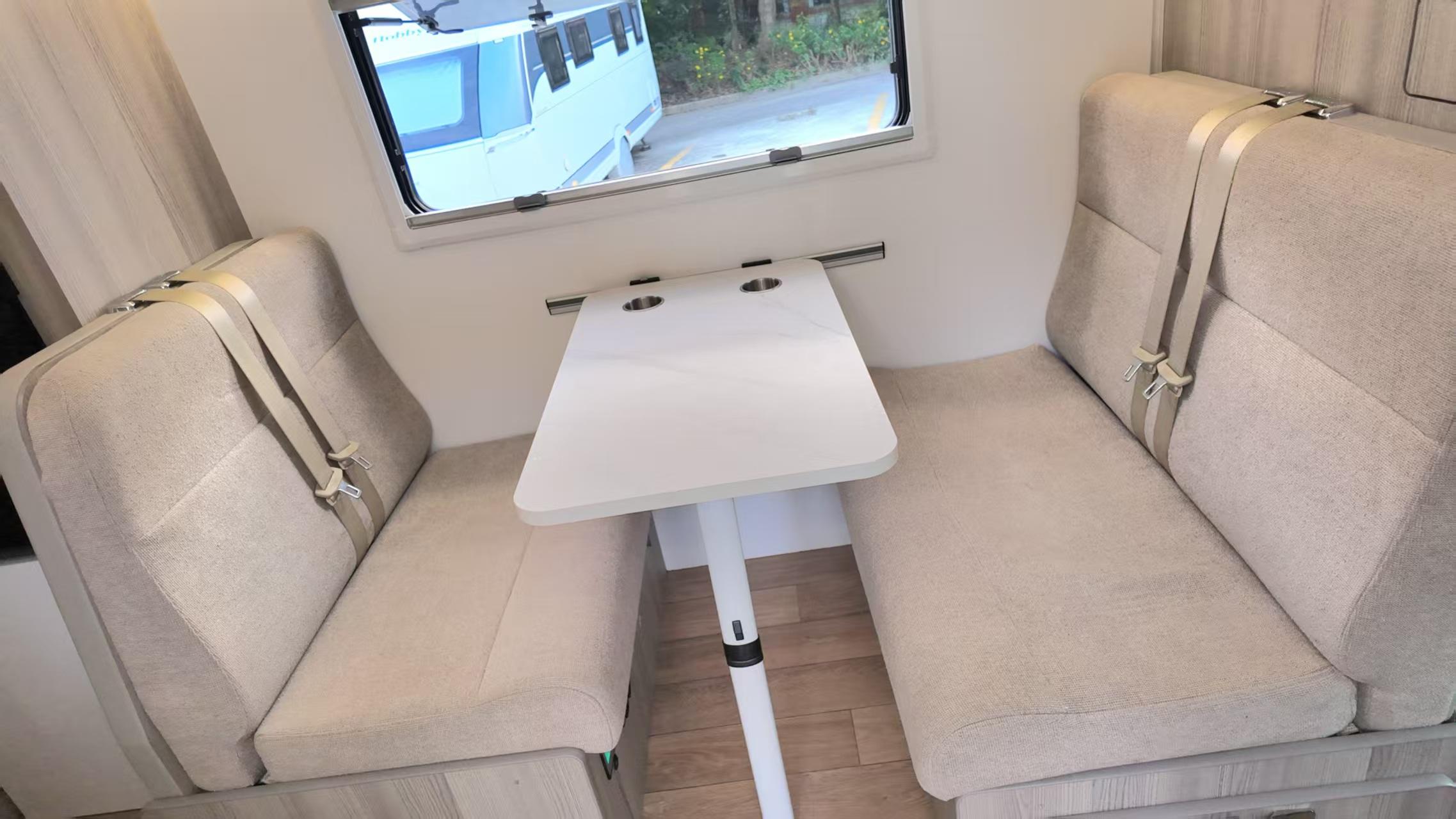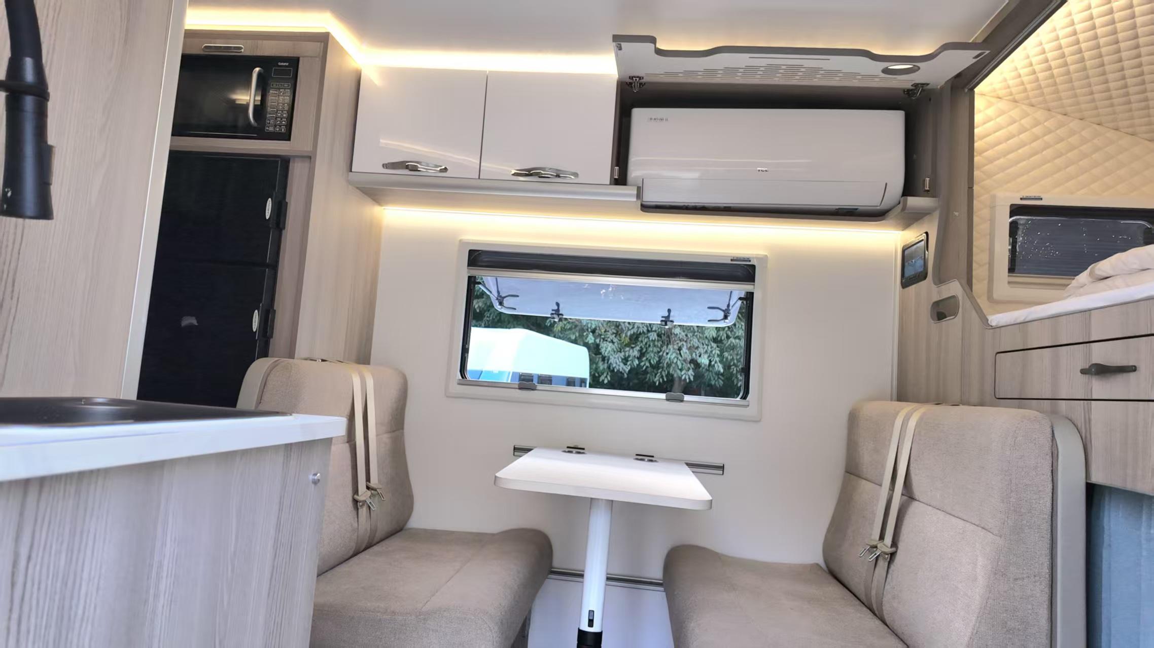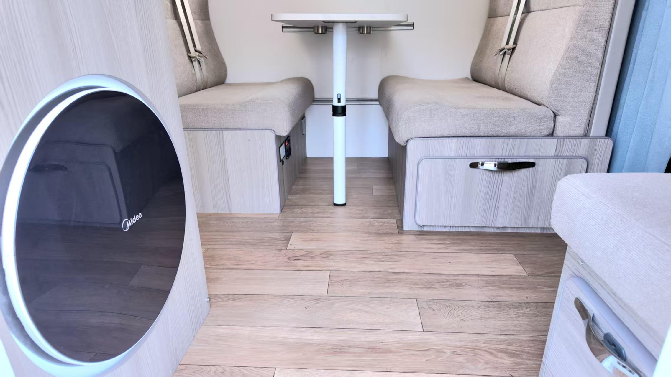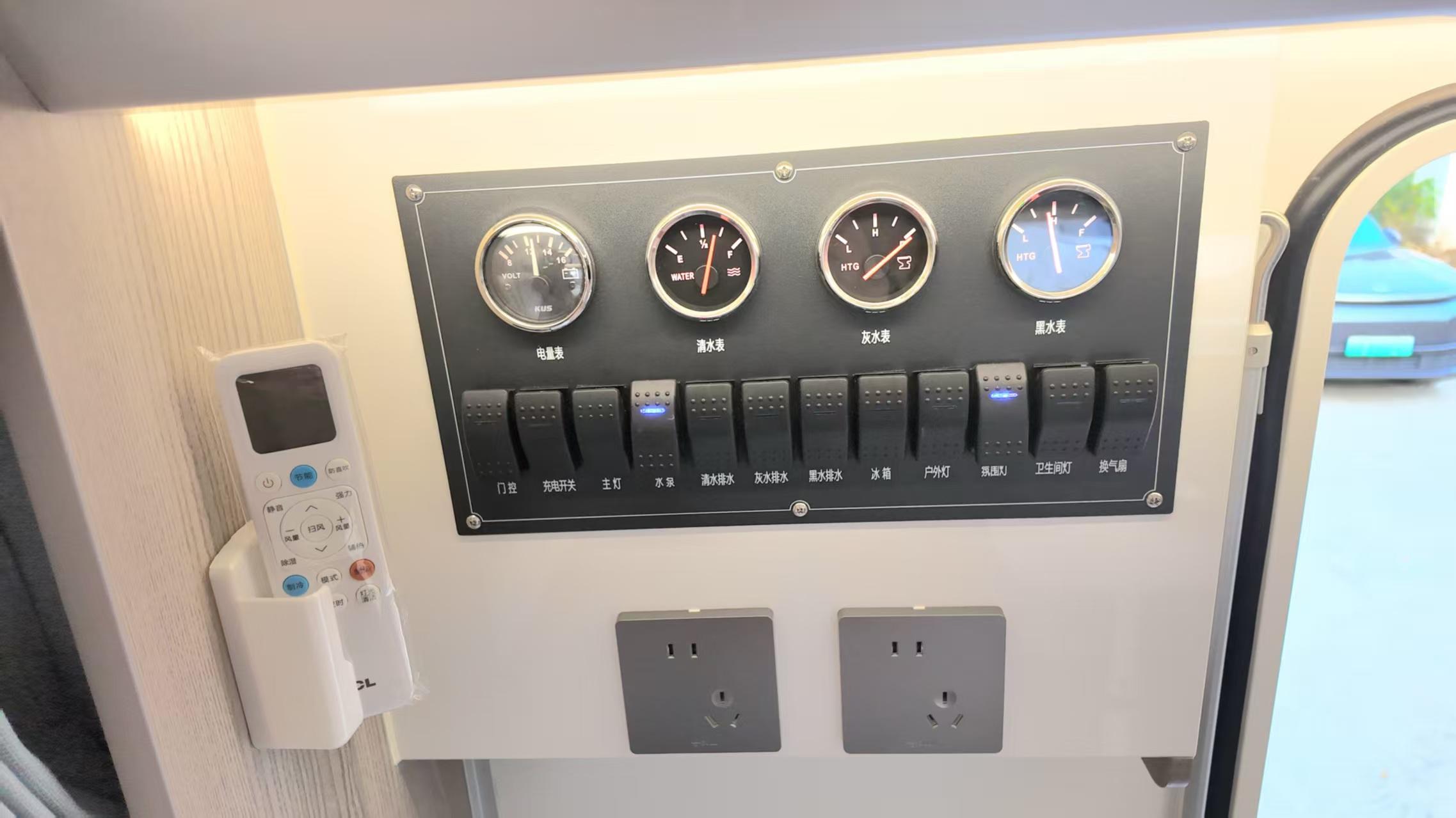 车辆配备车头LED灯,前后流媒体影像,车内四路监控,电子助力方向盘,高清倒车影像,驾驶室环保织物座椅,TCL冷暖大一匹变频静音节能家用空调,格兰仕光波炉、120升房车专用冰箱,对向卡座,不锈钢冷热水洗菜池,超大行李舱,全车隐私玻璃、防蚊纱窗沙门、房车中门电子密码锁、卫生间陶瓷一体马桶(专利电子粉碎式马桶,无需倾倒黑水箱,一键操作、方便洁净),灯光美妆镜、淋浴花洒及洗脸盆、洗手间换气扇,3公斤美的洗衣机。清水300升,灰水80升、黑水箱100升,户外遮阳棚和LED露营氛围灯,户外冷热水花洒、电动上车踏步,配有户外餐厨操作托架及电磁炉、户外桌椅一套(一桌四椅)。