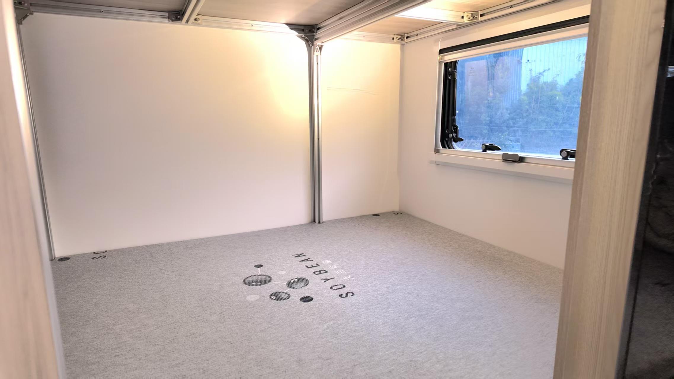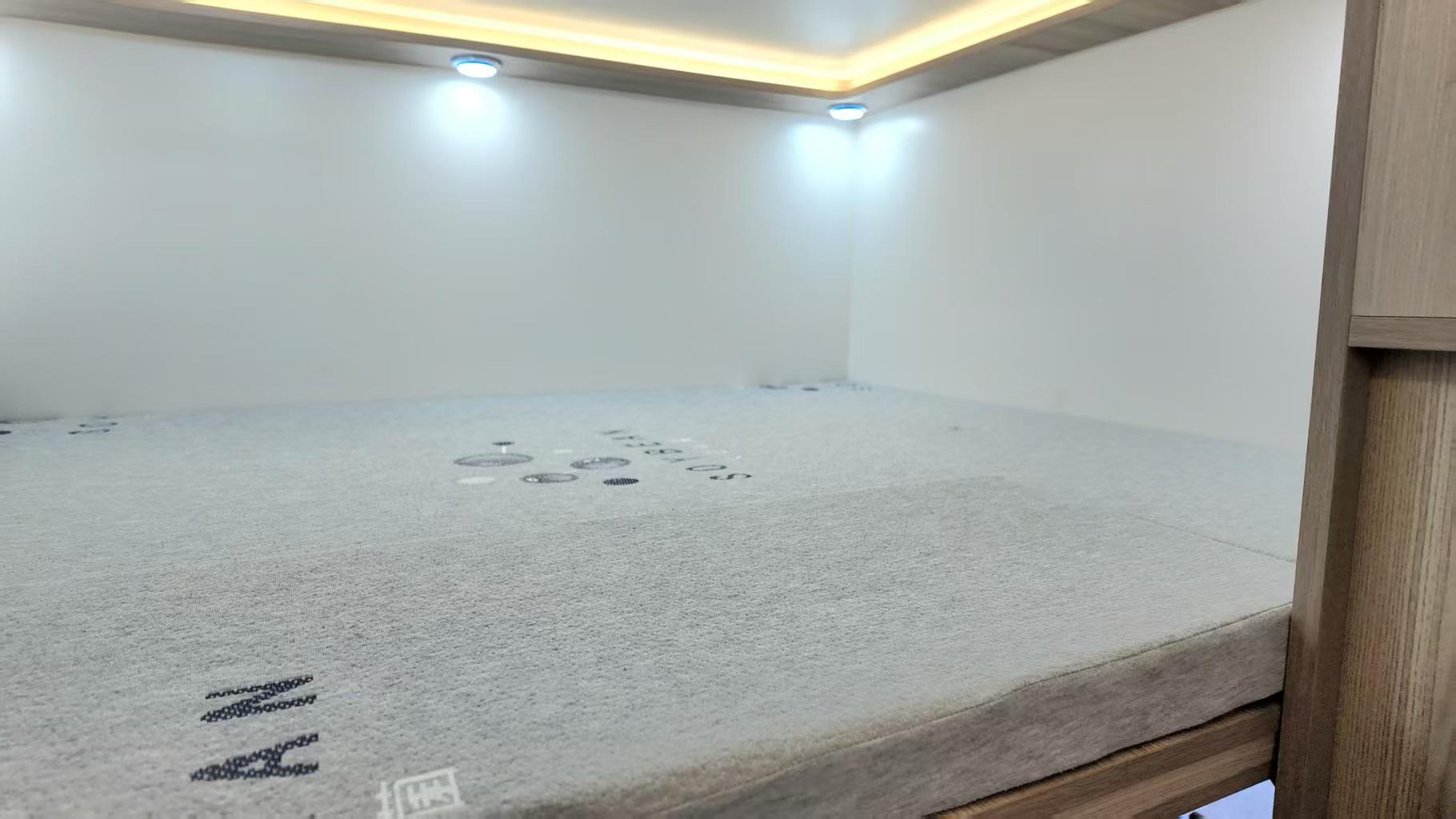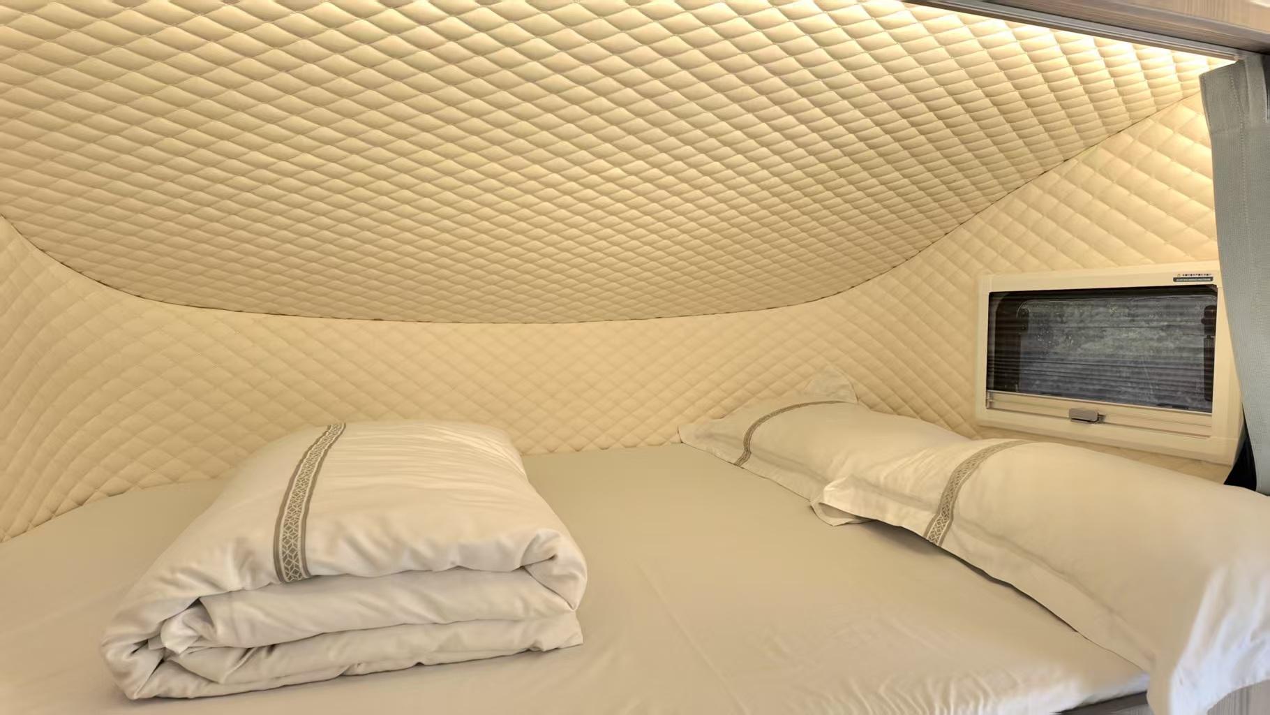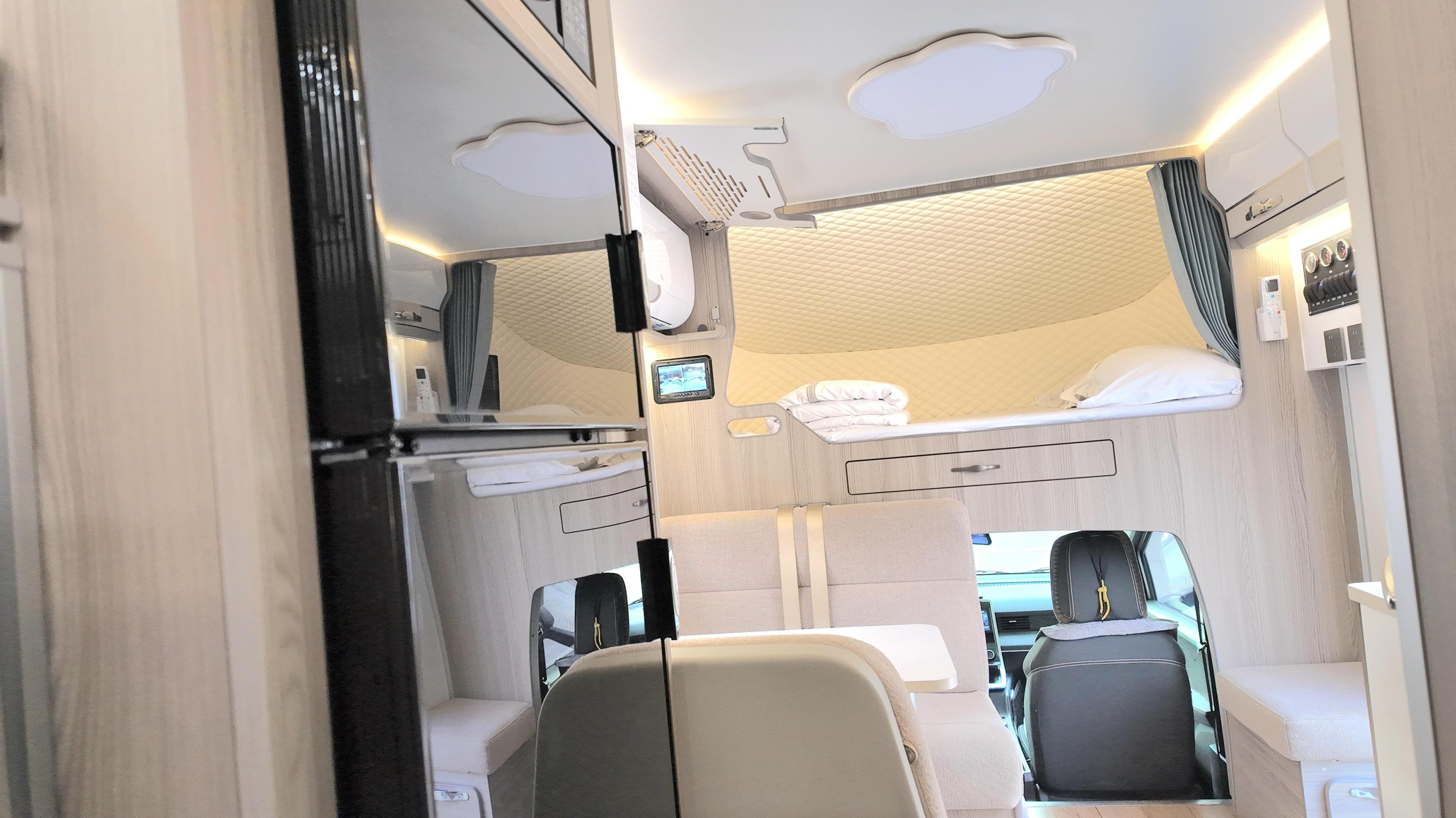 长5995 宽2126 高2875 荷载6人,为前额头床+后横向双床上下铺车型,床位布局为3+1,配有三张固定床铺(1350×2010×1,1200×2010×2),一张临时床,为对向卡座拼床。