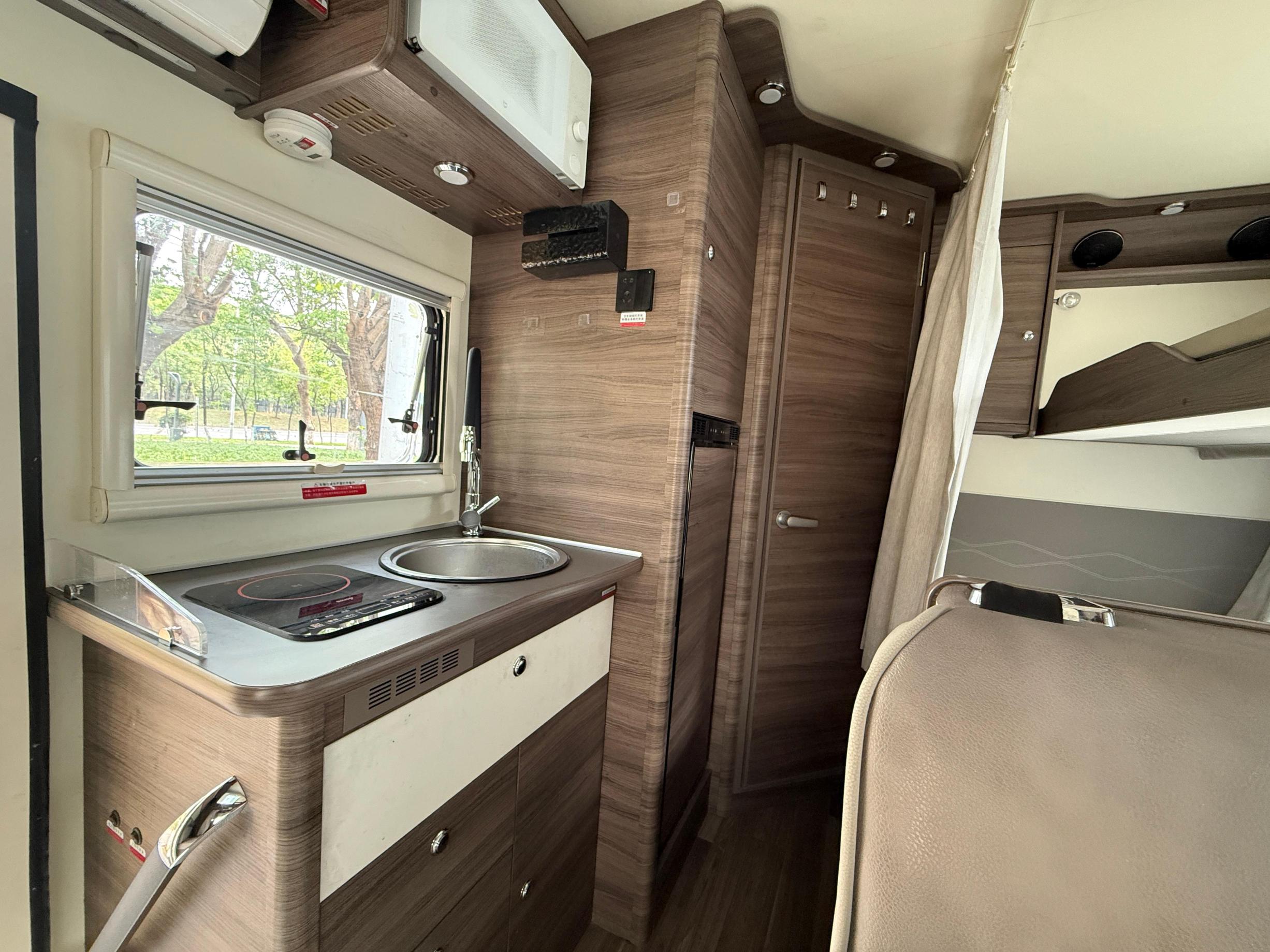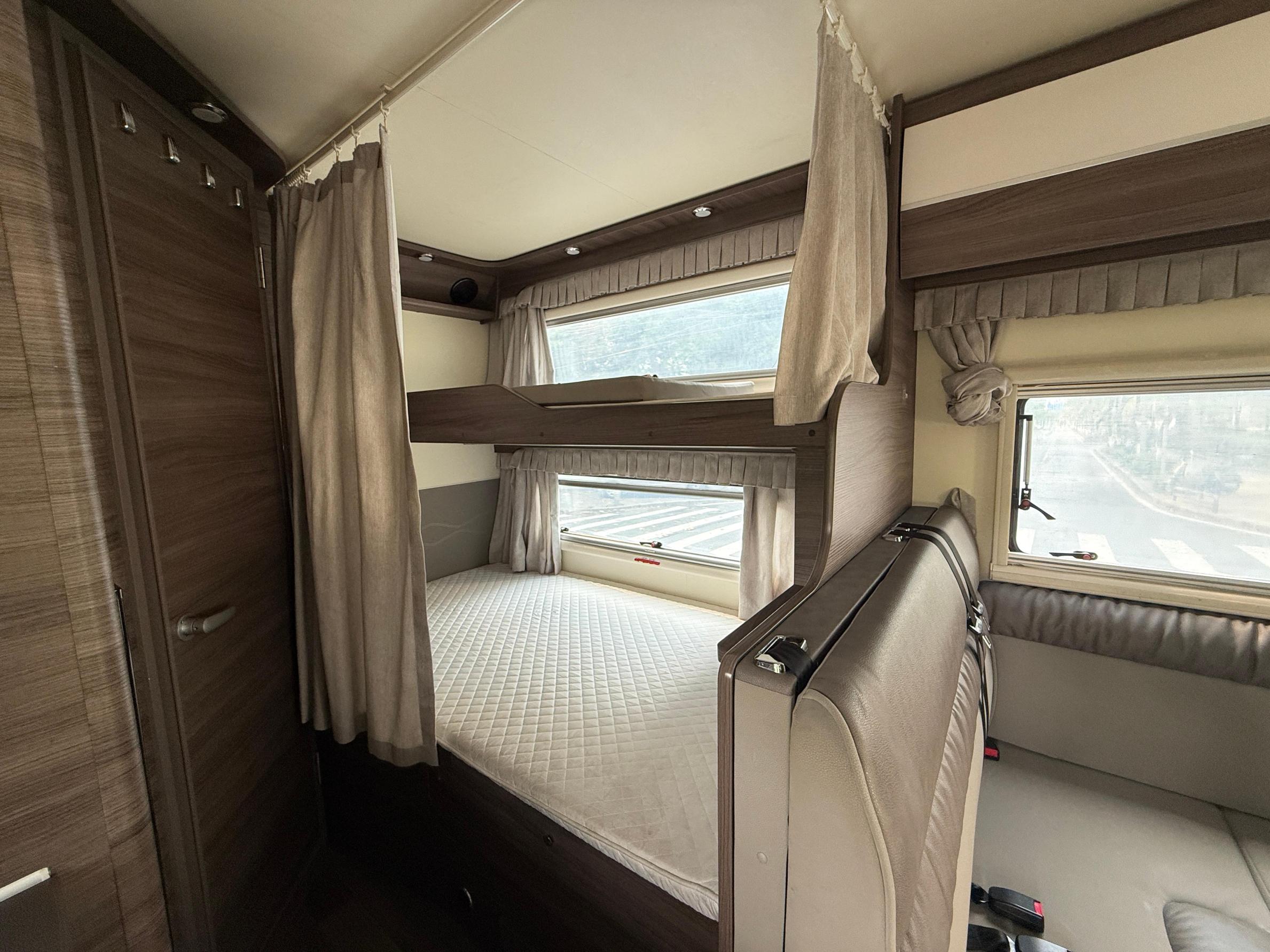 后仓为纵置子母床,上床可翻折,配备豪华高回弹床垫,床位顶部设